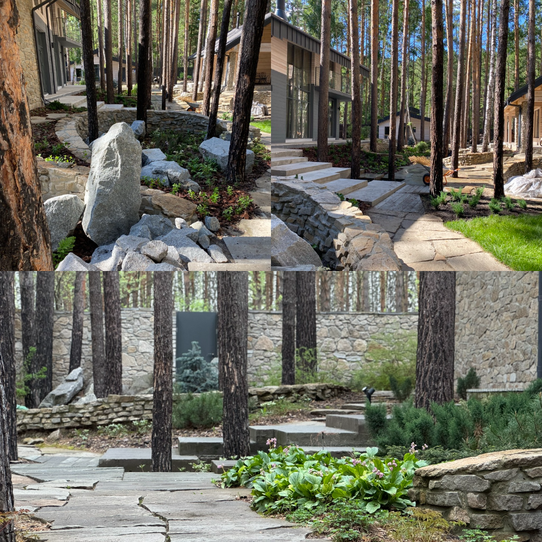 Проектирование ландшафта началось с уже готовой архитектурой и благоустройством: облицовка дома натуральным камнем, бетоном и деревом, баня из двухкантного бруса, дорожно-тропиночная сеть из крупноформатного плитняка и бетона.